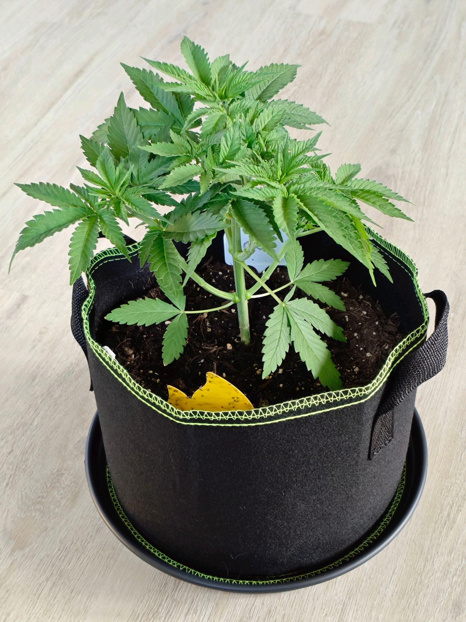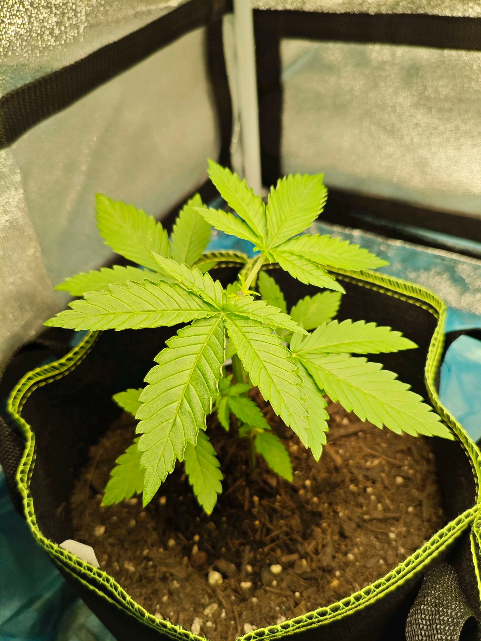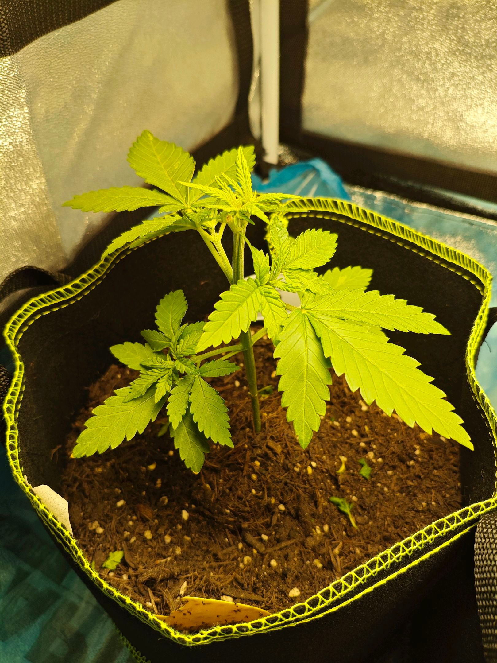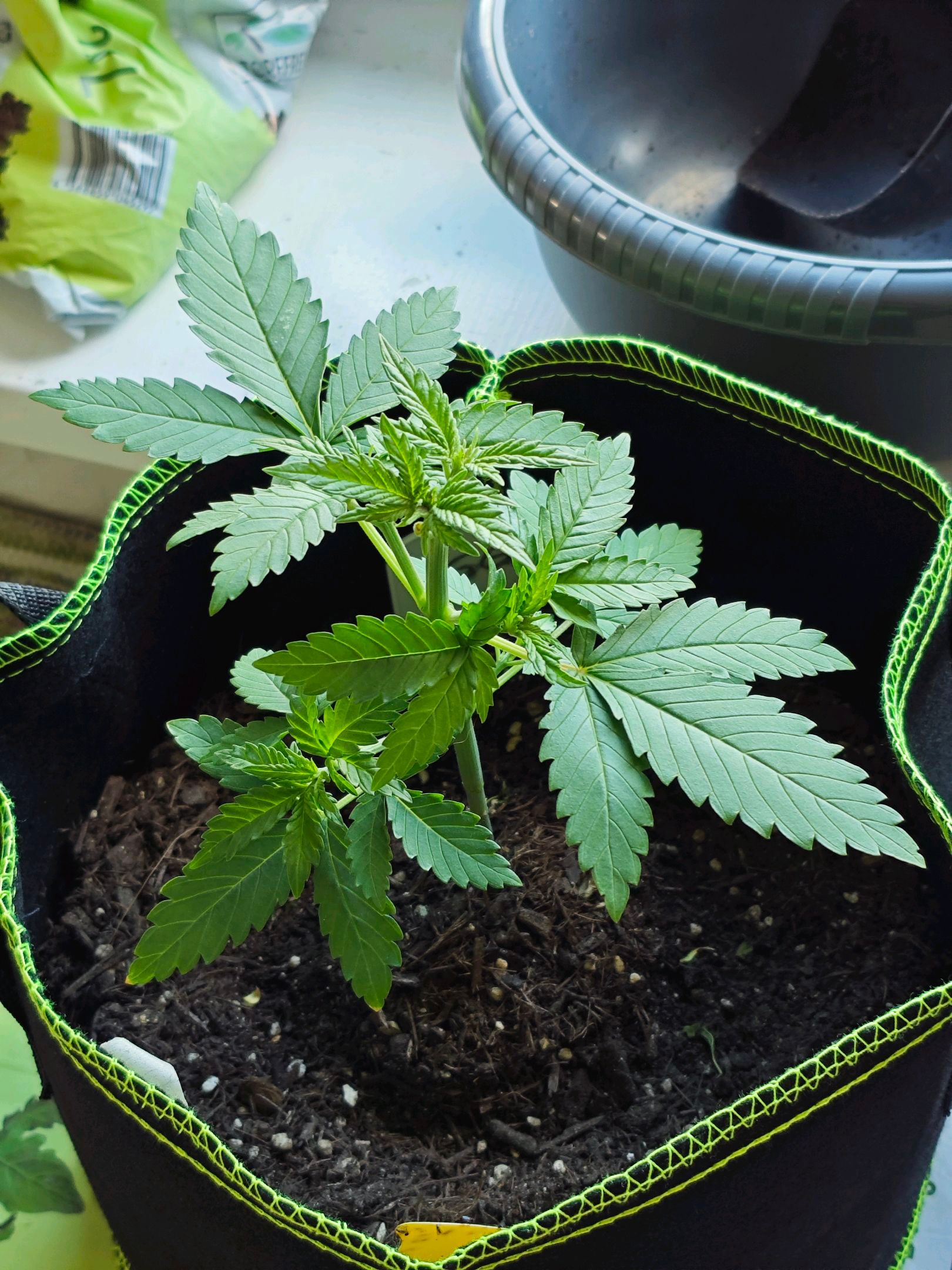 Plant looks healthy, so I chose to fill up the plant bag it's growing in with some more soil. The mixture is organic universal soil, chicken manure pellets, a little bit of finely crushed egg shells and a tiny pinch of mycorrhizal inoculant.