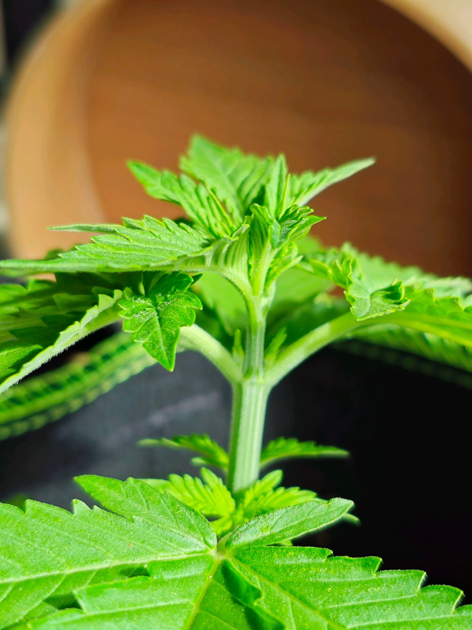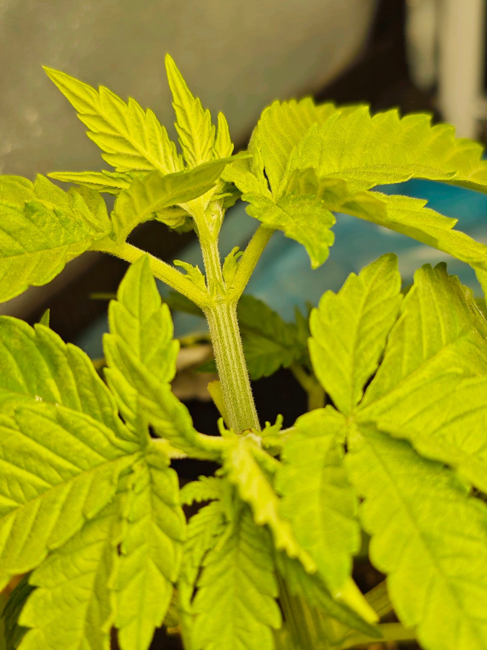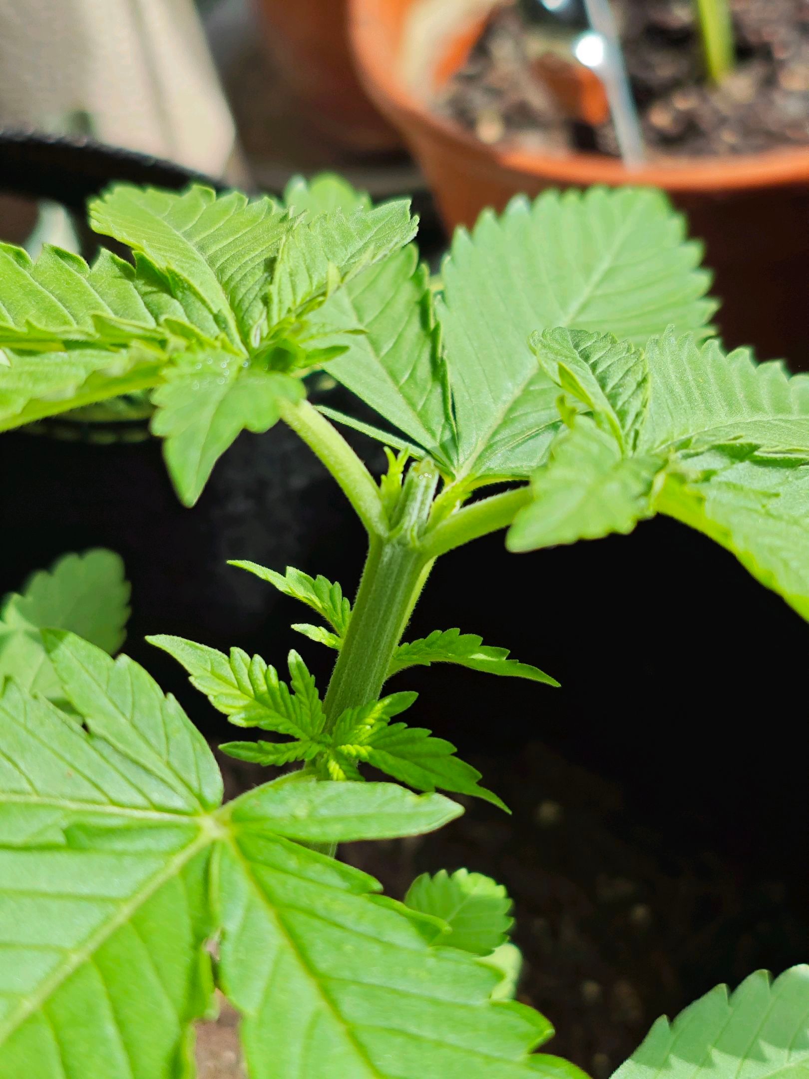 Removed two fan leaves at the top to improve light penetration. We'll see if the two branches survive/benefit from this. If not, they'll be removed in the next few days.