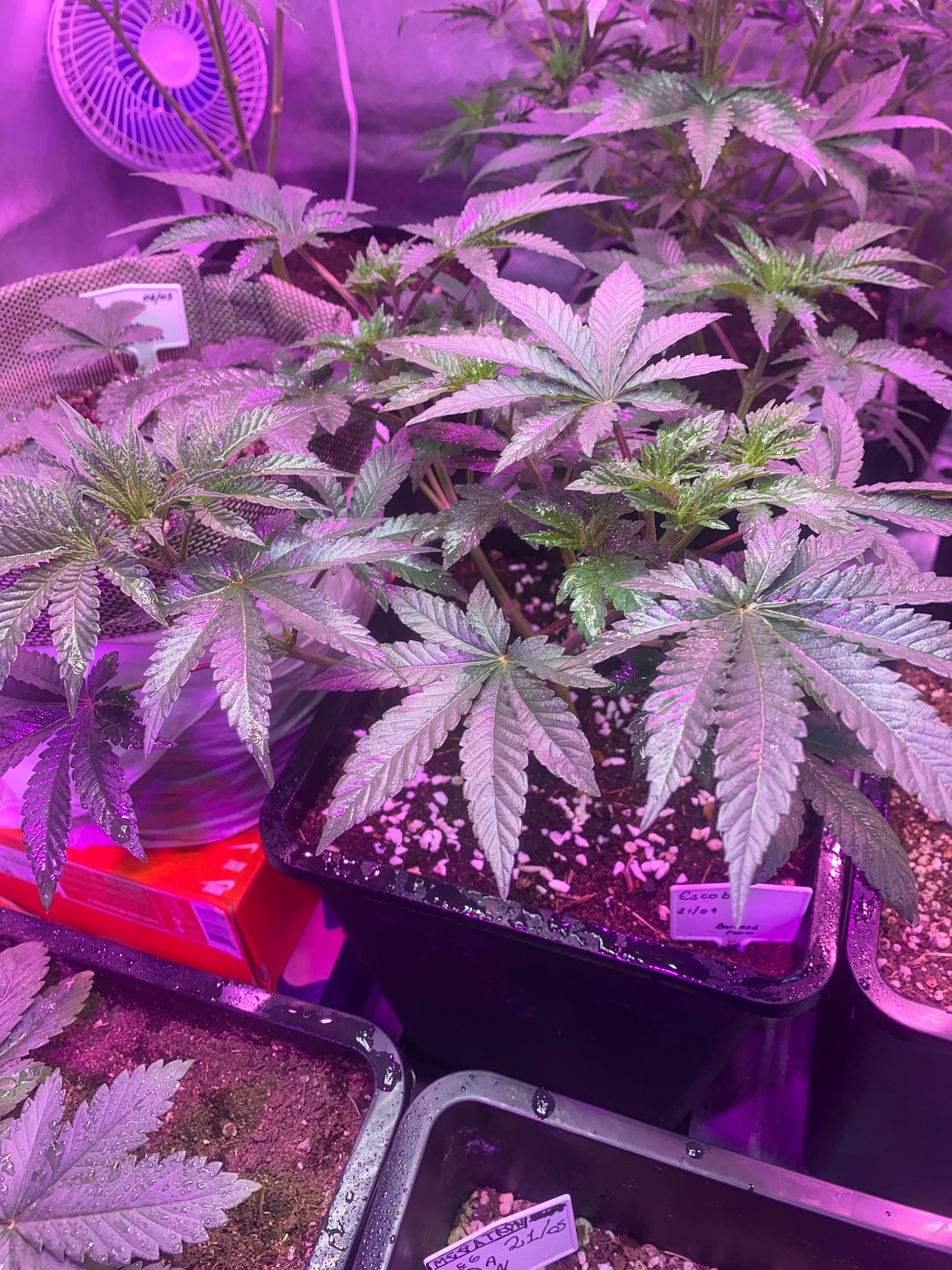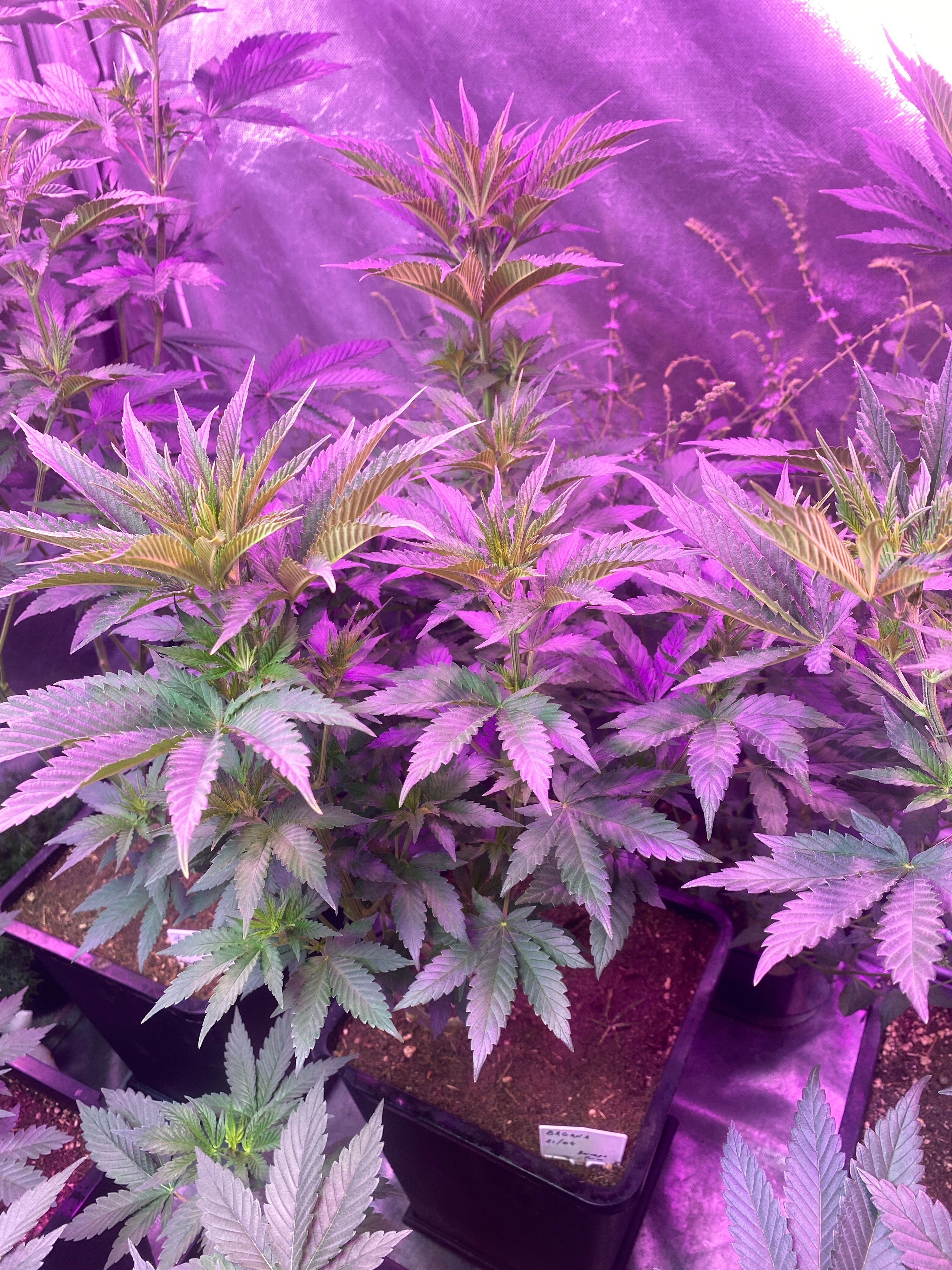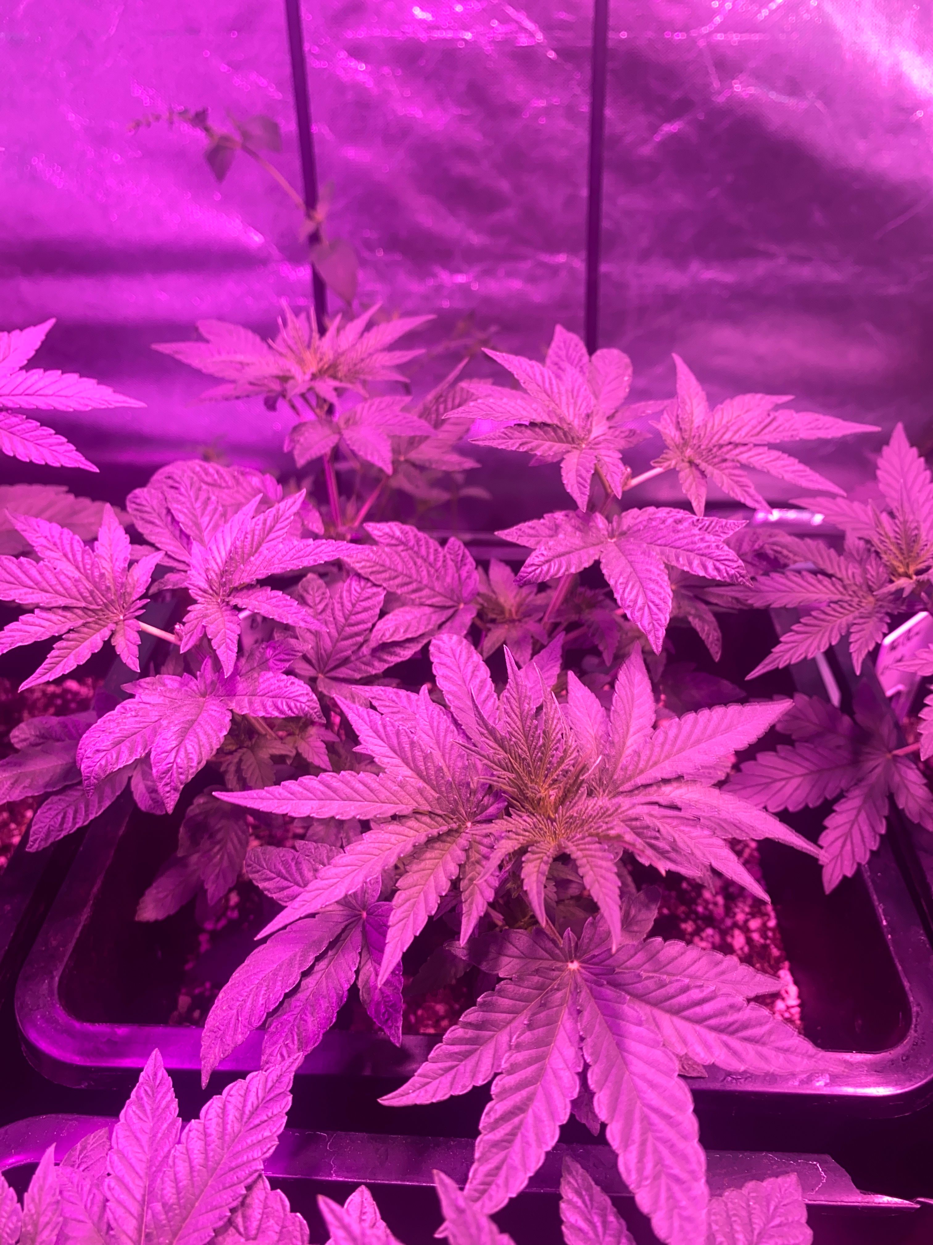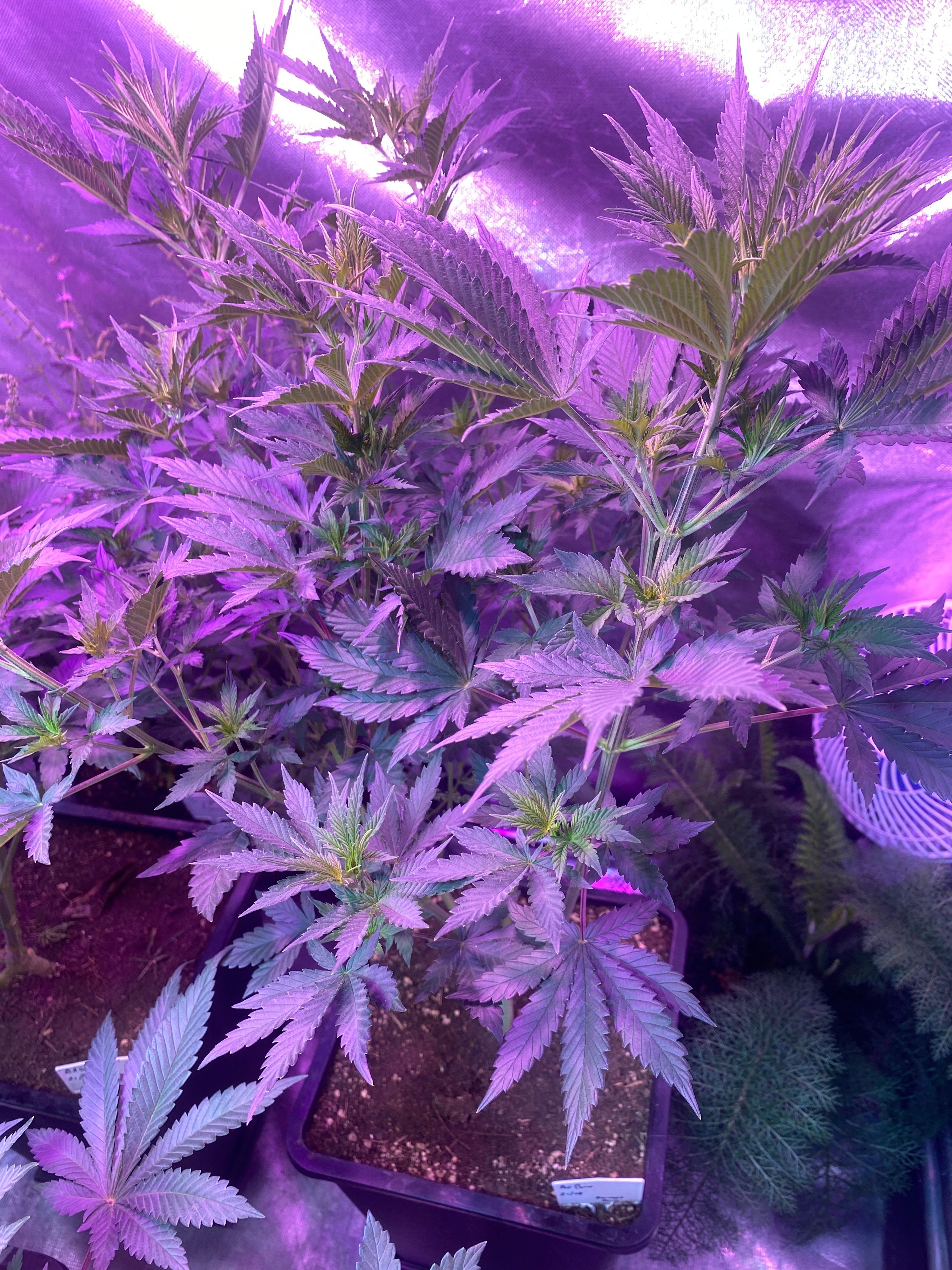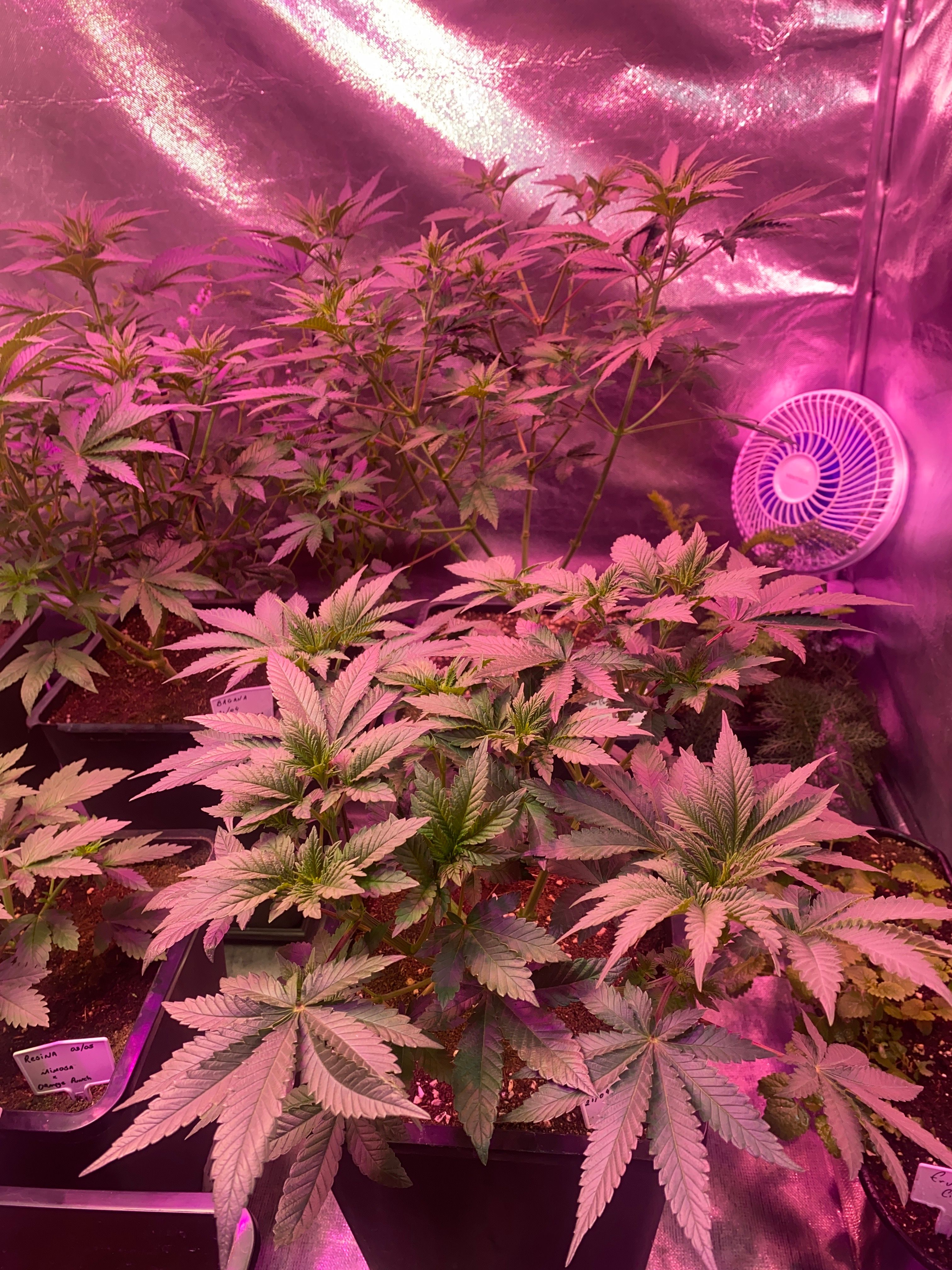 Plantas saudáveis. Amarelos indo pro roxo em decorrência da natureza da strain. Lindas e já apresentando cheiro bom.