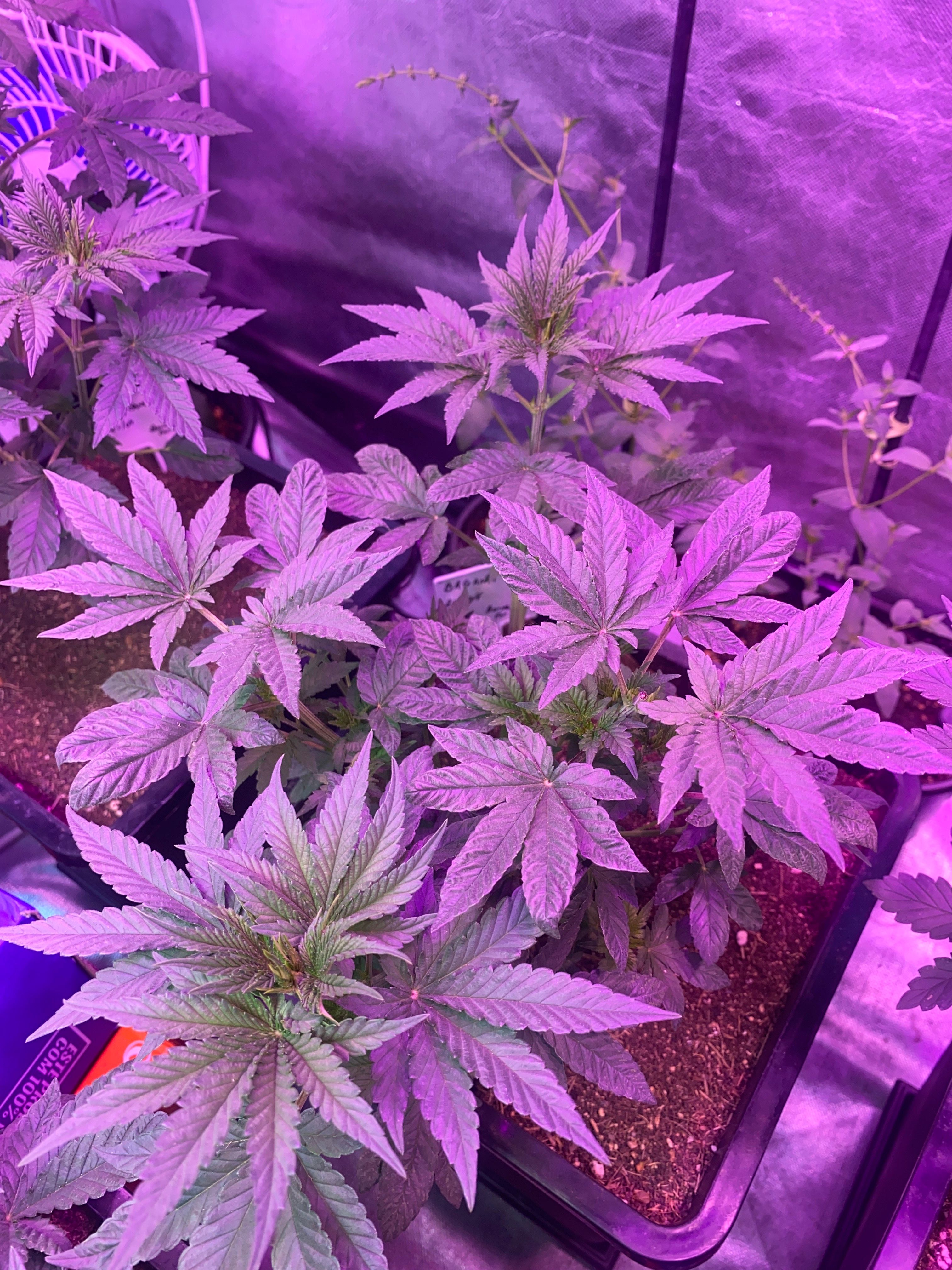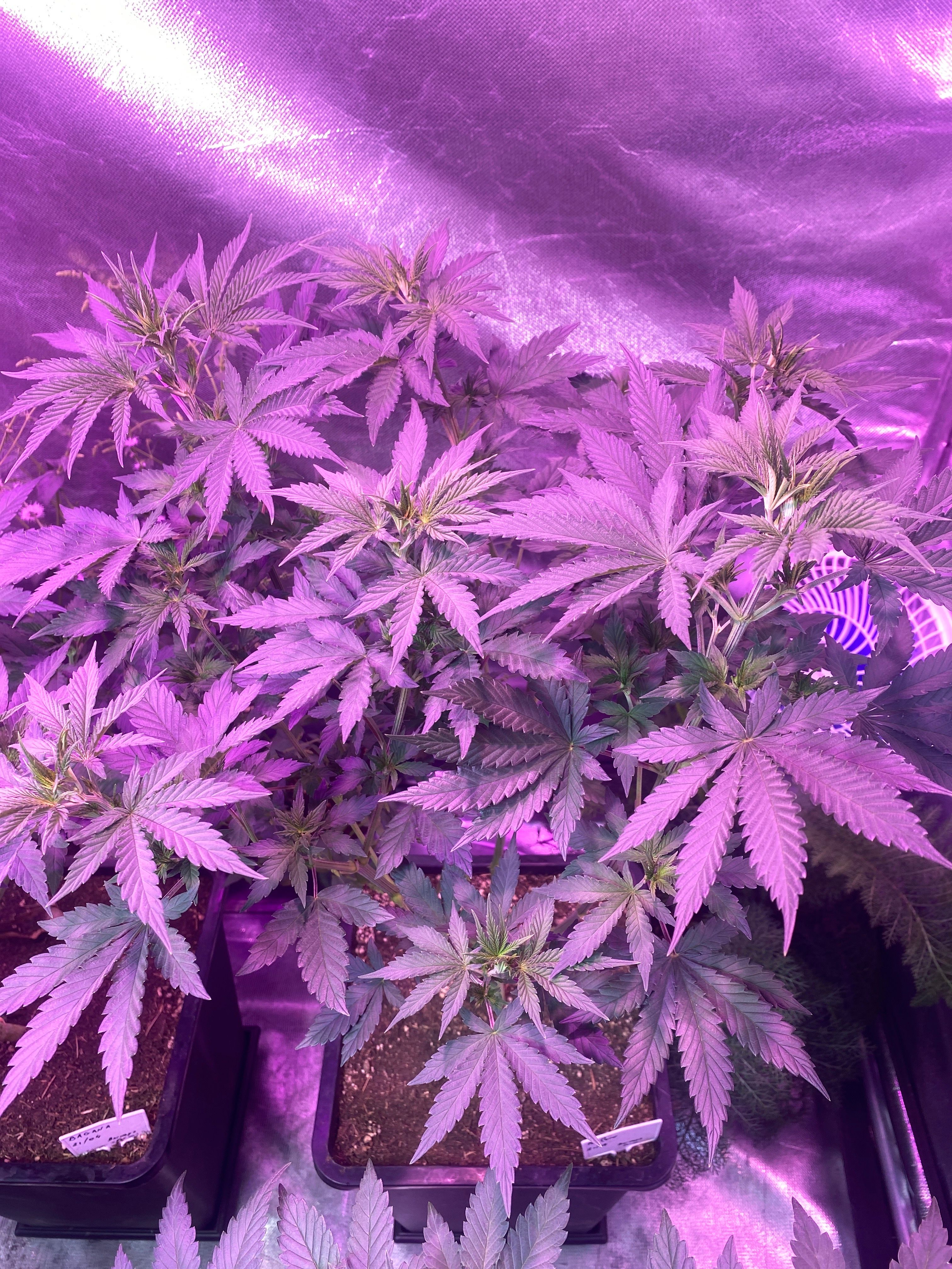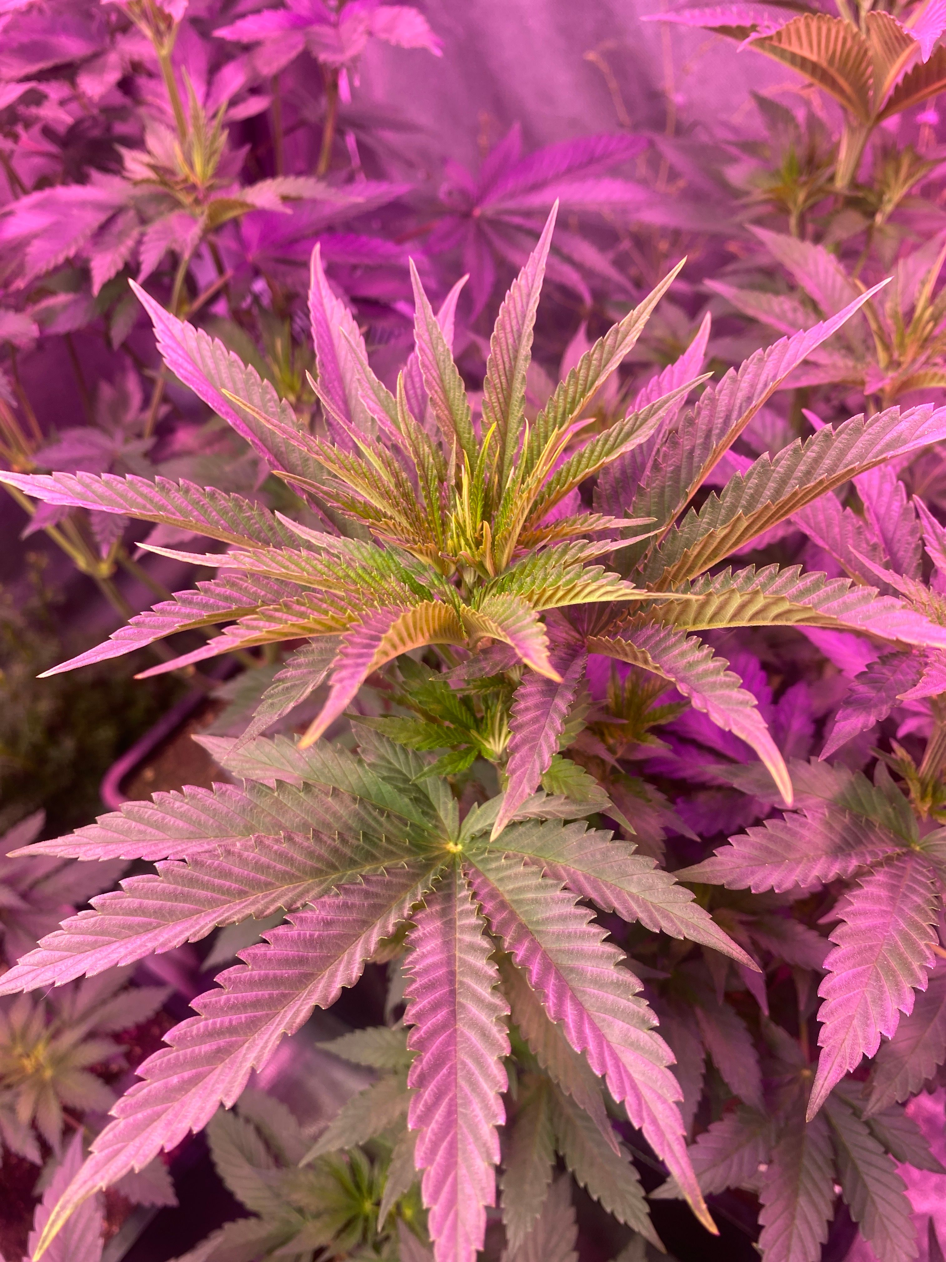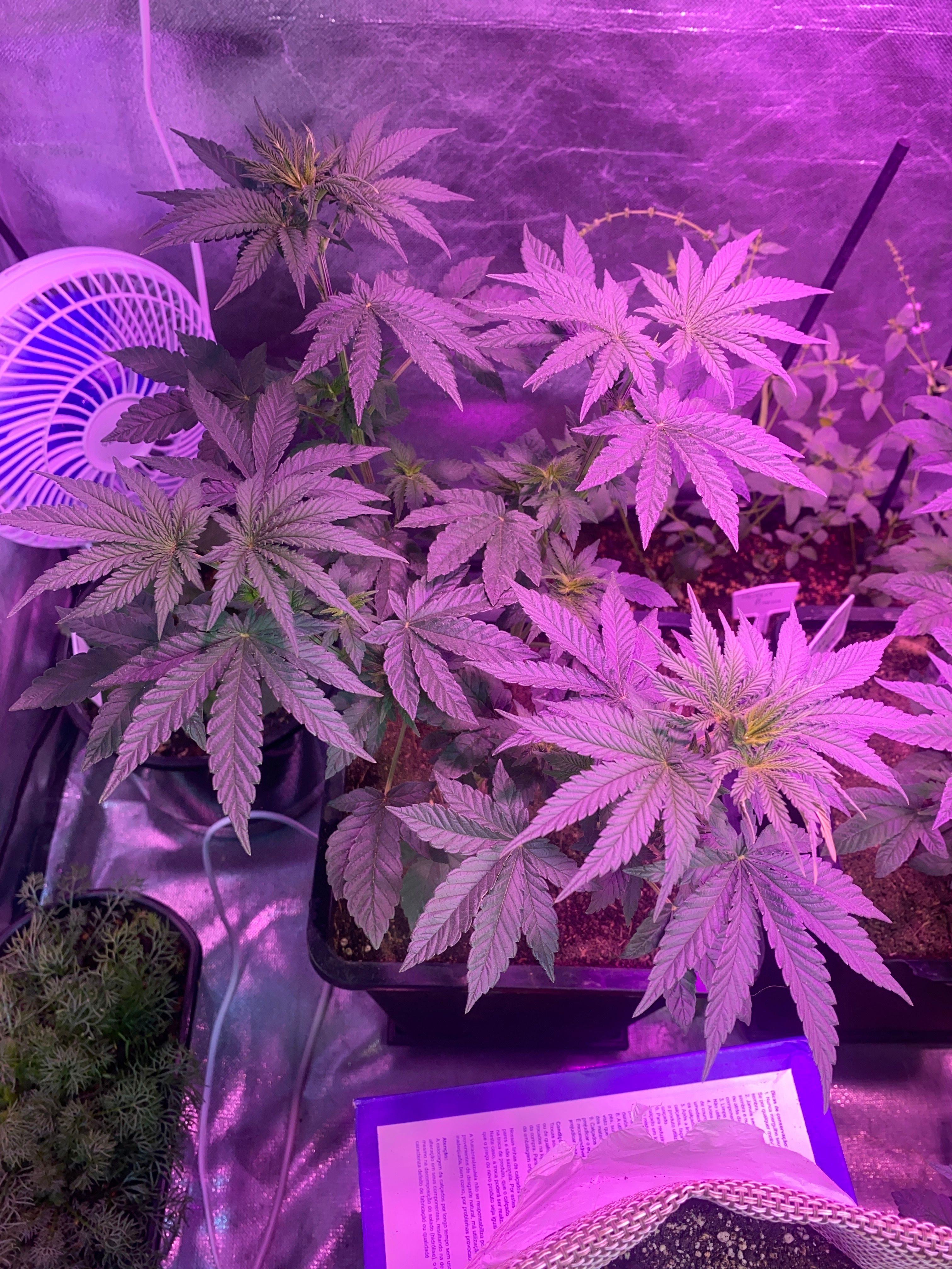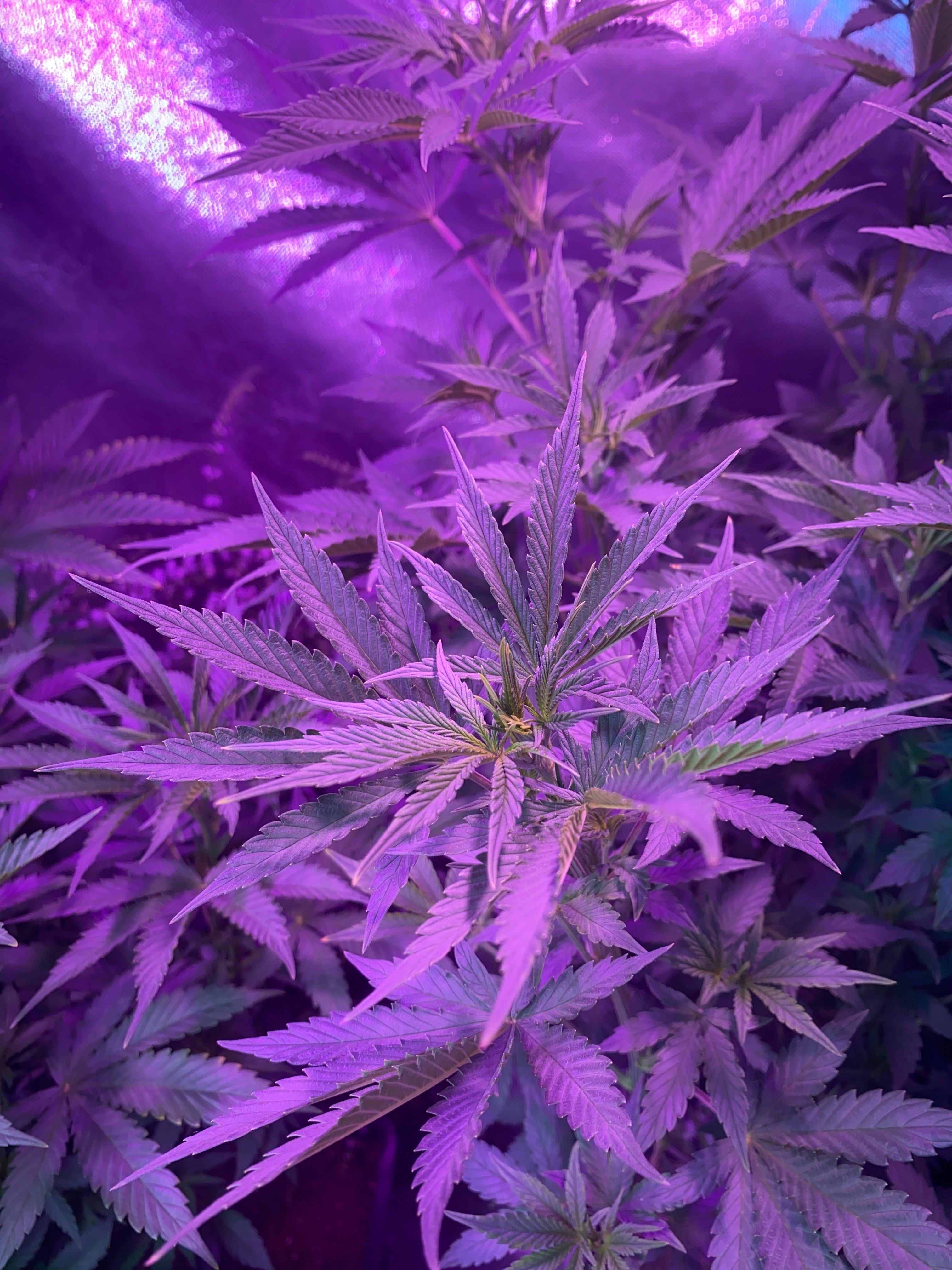 Plantas saudáveis. Amarelos indo pro roxo em decorrência da natureza da strain. Lindas e já apresentando cheiro bom.