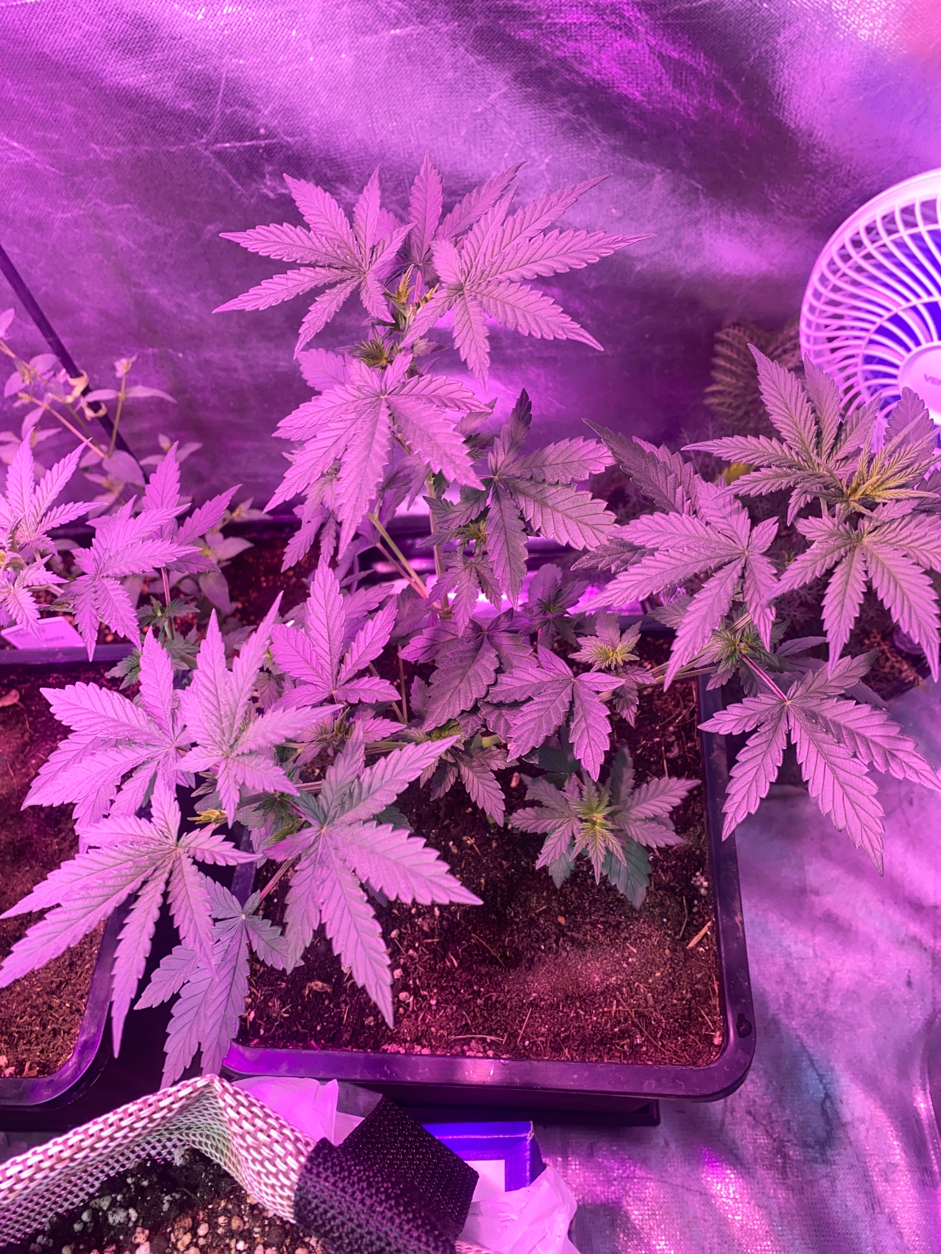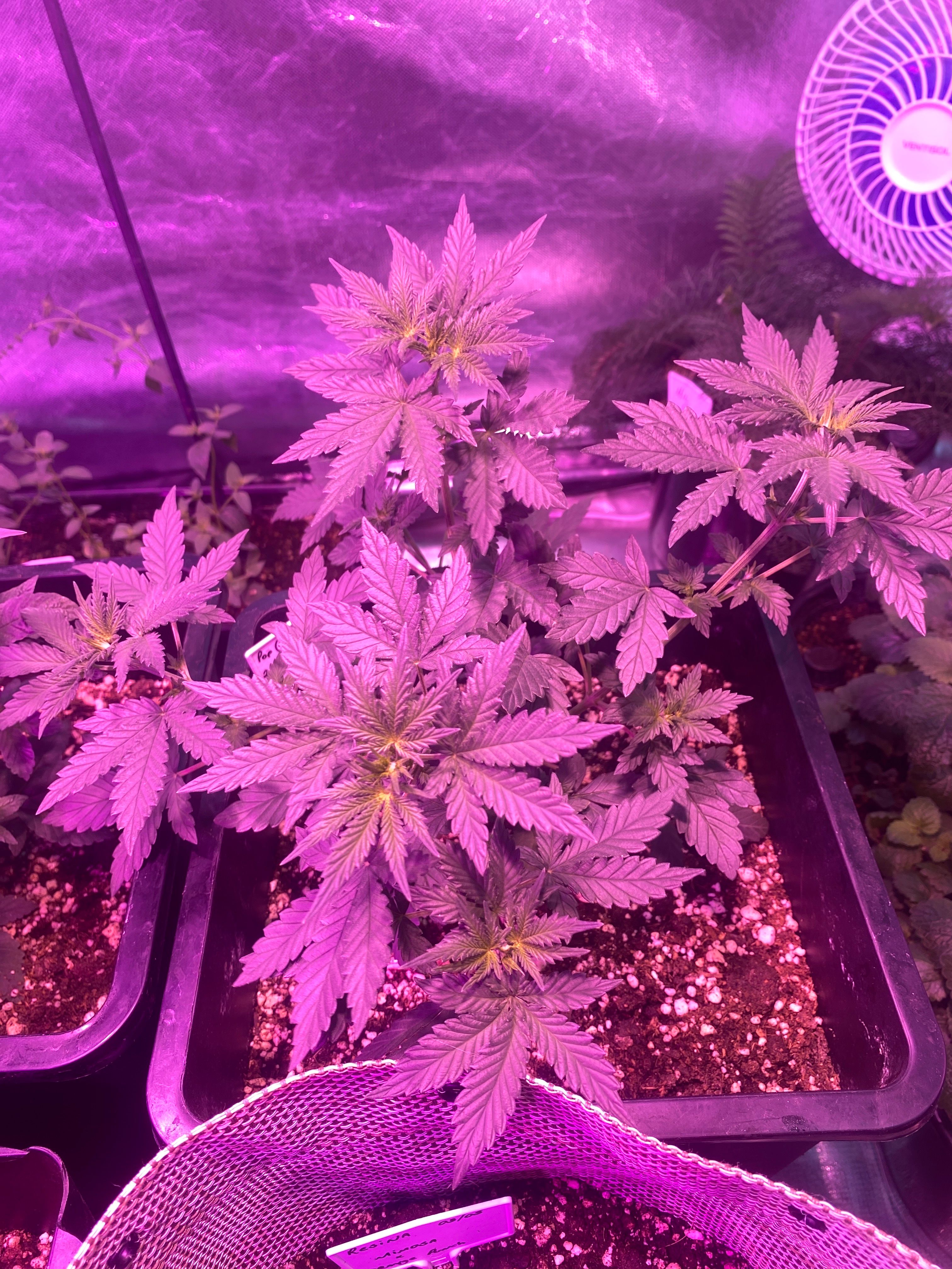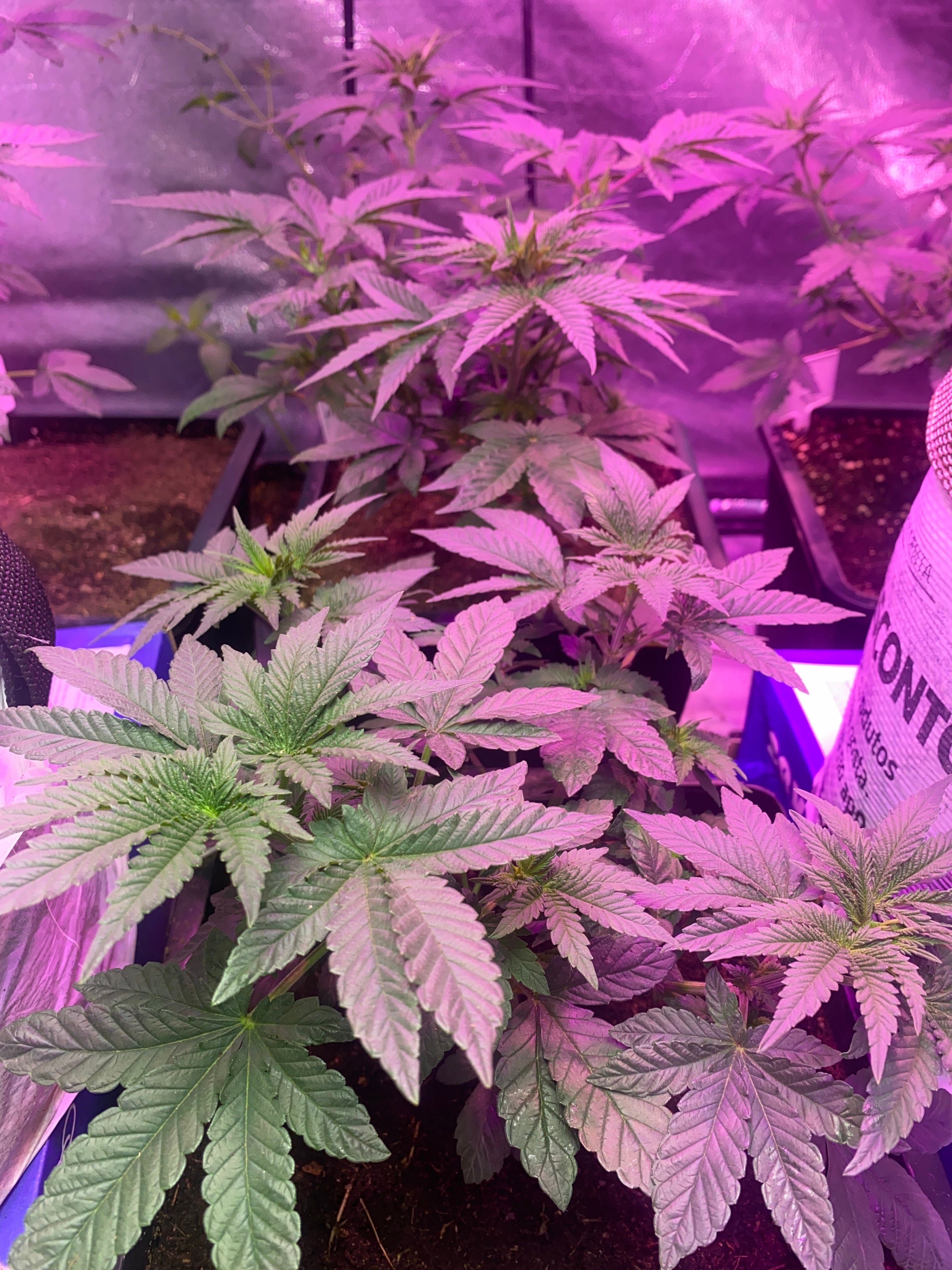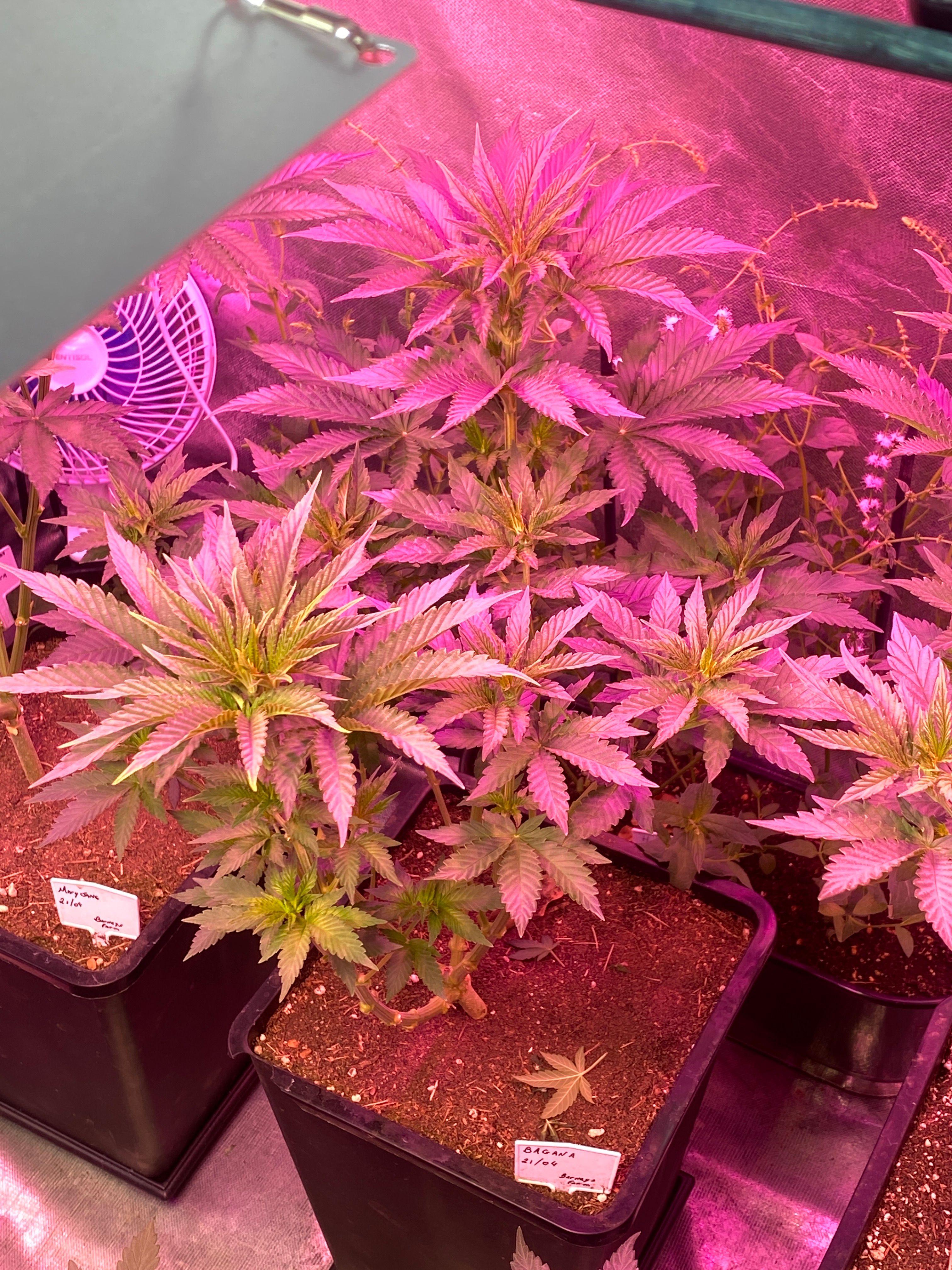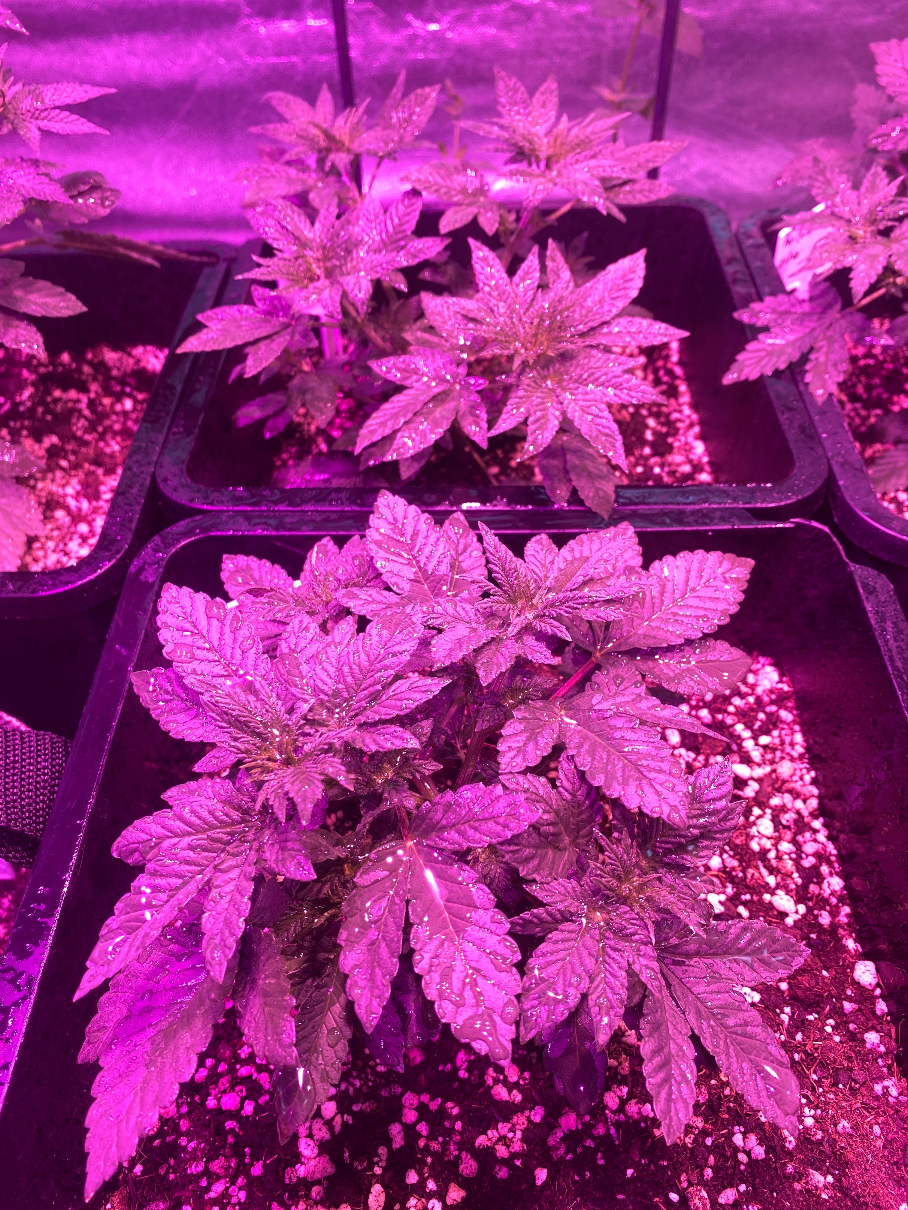 Plantas saudáveis. Amarelos indo pro roxo em decorrência da natureza da strain. Lindas e já apresentando cheiro bom.