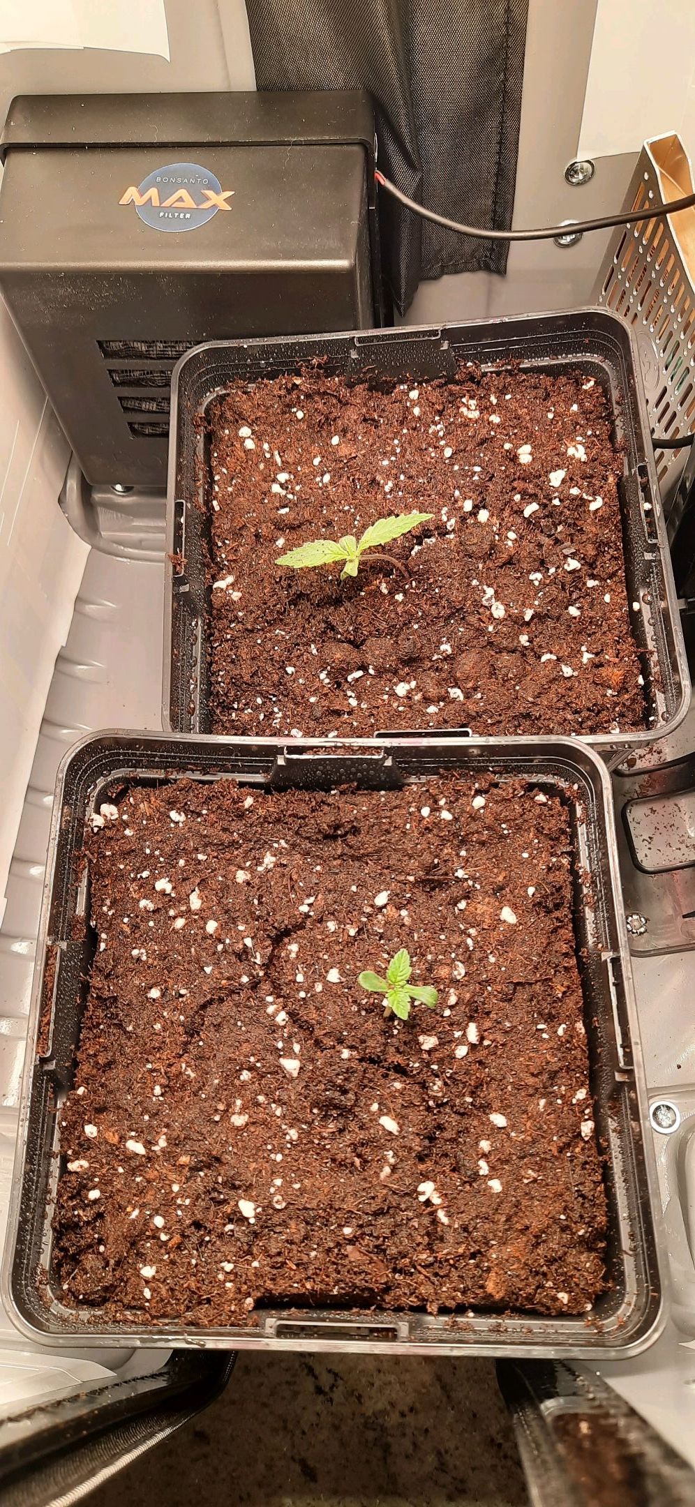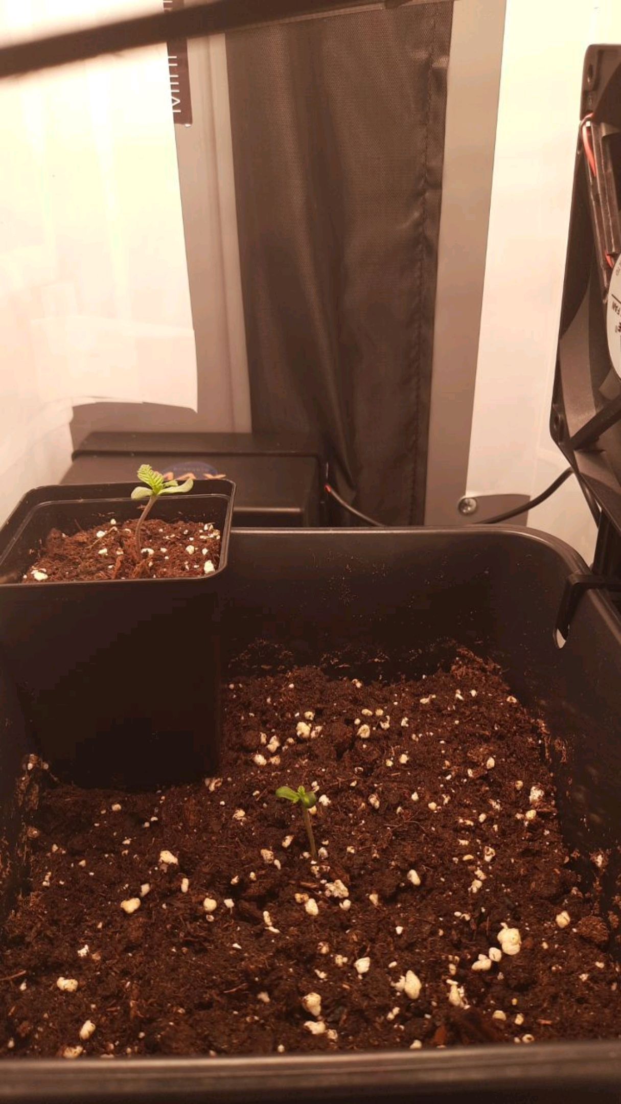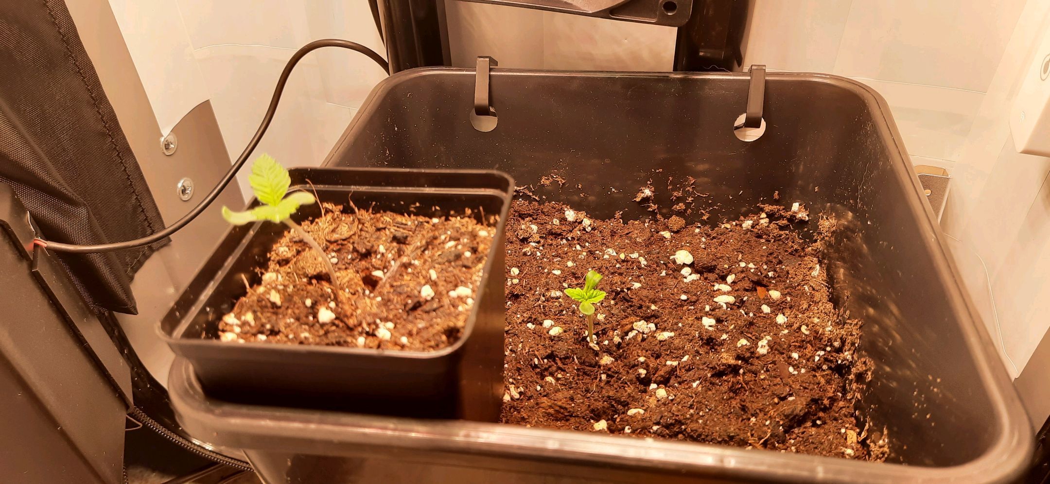 Topfanpassung vorgenommen. Samen 2 in grösseren 3L, Samen 1 in kleineren 3L Topf umgepflanzt. Notwendig trotz Risiko in Keimlingsphase aufgrund kurzfristiger, anstehender Dienstreise 17-19.04.