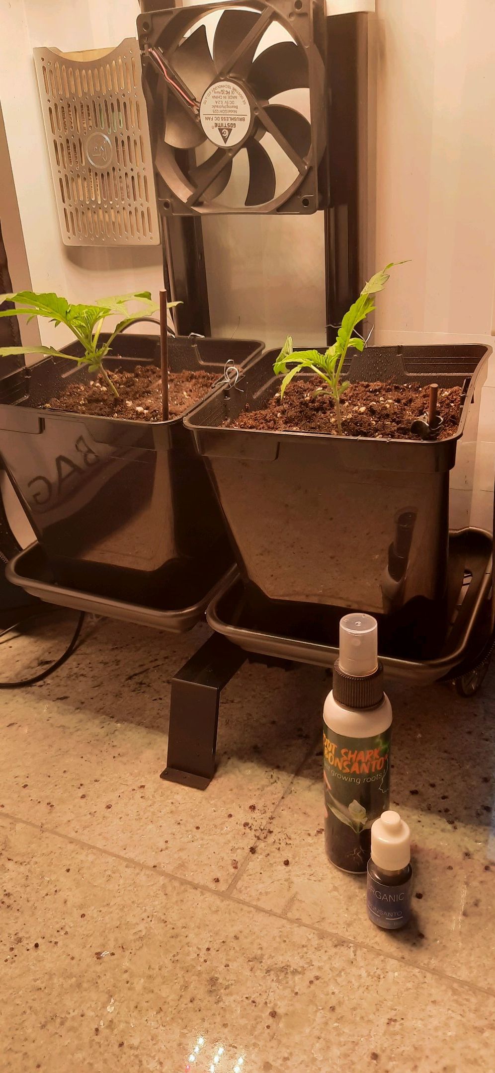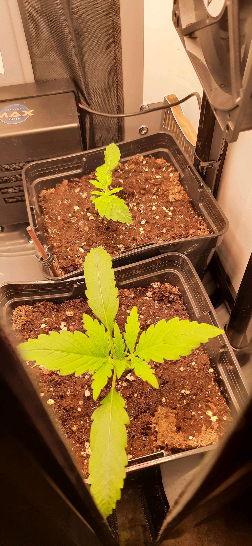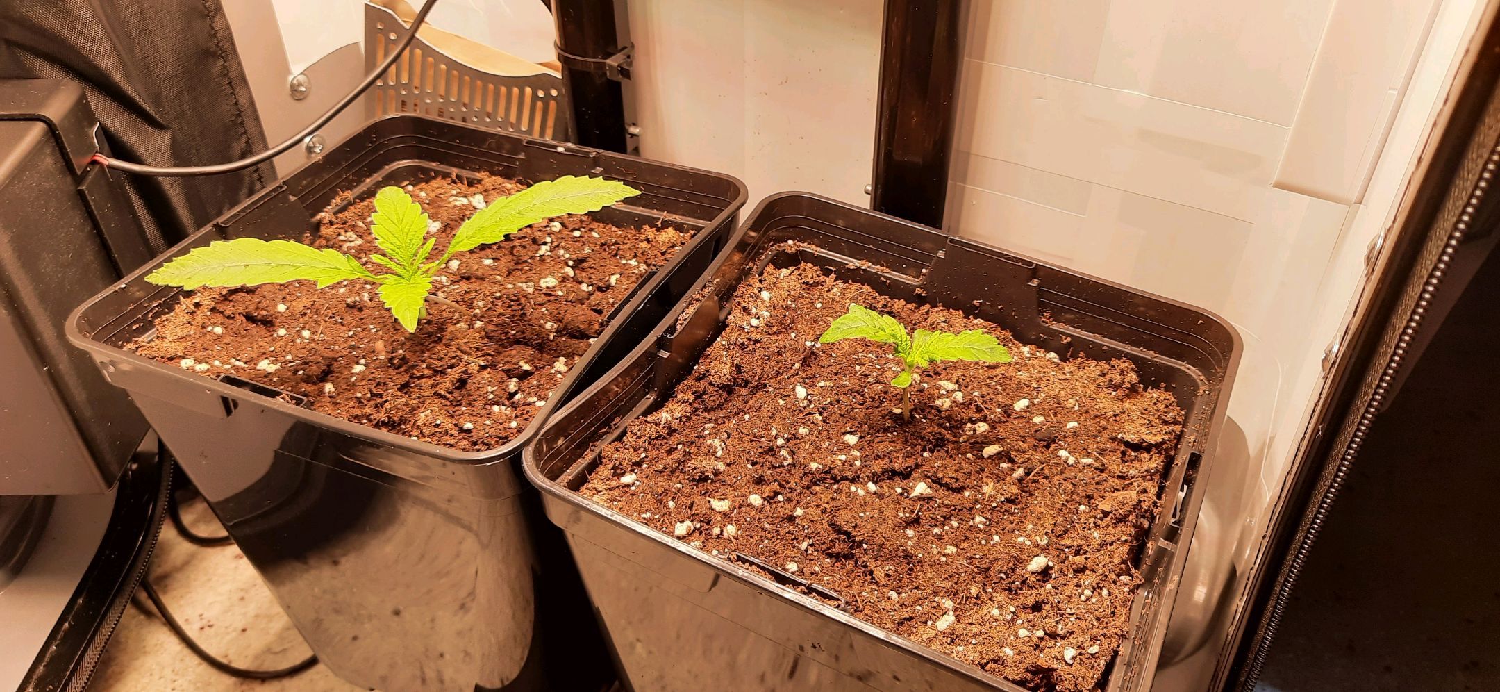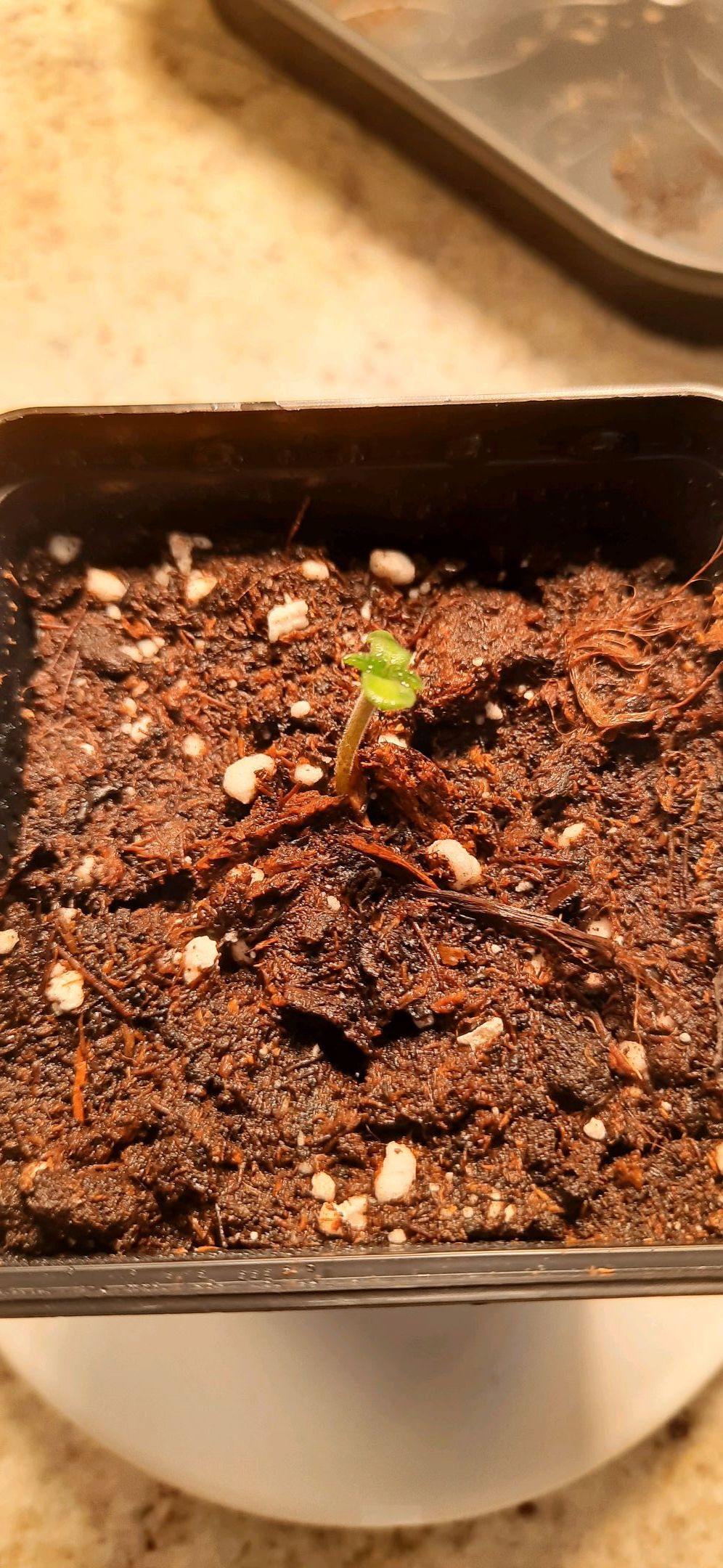 Topfanpassung vorgenommen. Samen 2 in grösseren 3L, Samen 1 in kleineren 3L Topf umgepflanzt. Notwendig trotz Risiko in Keimlingsphase aufgrund kurzfristiger, anstehender Dienstreise 17-19.04.